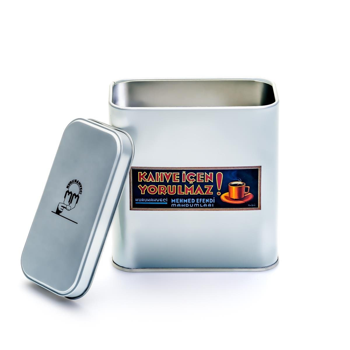 Kurukahveci Mehmet Efendi arşivinden: 1933 yılına ait "Kahve İçen Yorulmaz" reklam sloganı baskılı kahve saklama kutusu.