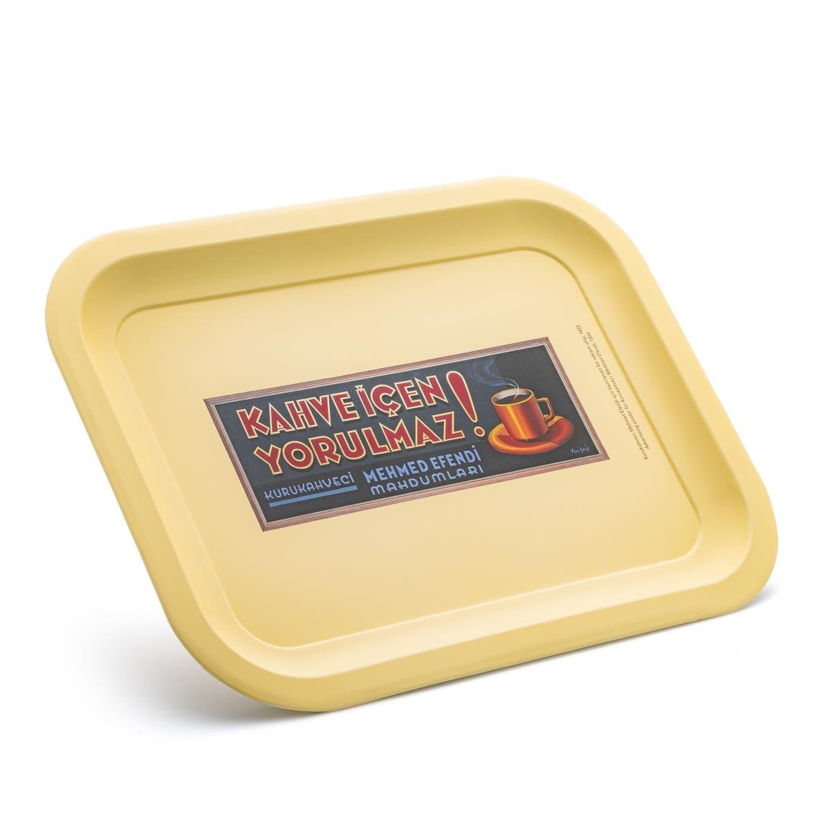 Kurukahveci Mehmet Efendi arşivinden: 1933 yılına ait "Kahve İçen Yorulmaz" reklam sloganı baskılı kahve tepsisi.