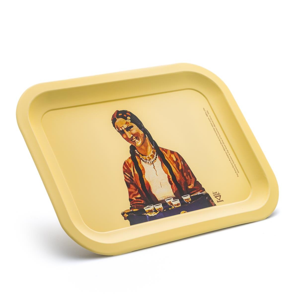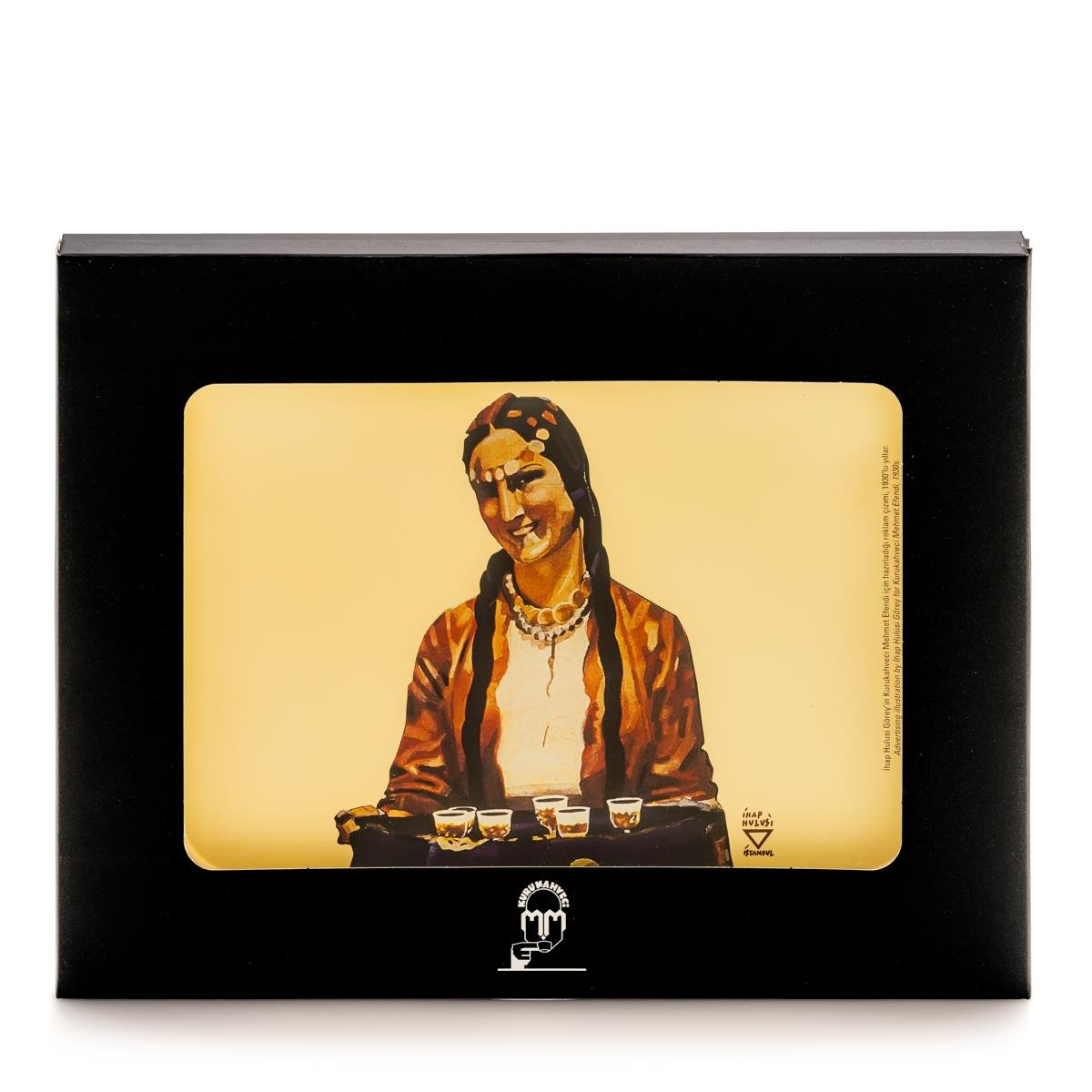 Kurukahveci Mehmet Efendi arşivinden: 1930'lu yıllarda İhap Hulusi Görey'in Kurukahveci Mehmet Efendi için hazırladığı reklam afişinden detay görselli kahve tepsisi.